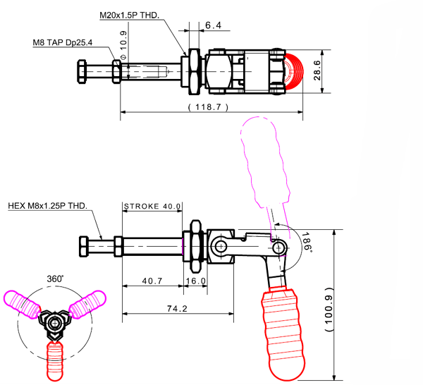 150 281 186˚ M8 x 50.0L 40 Threaded